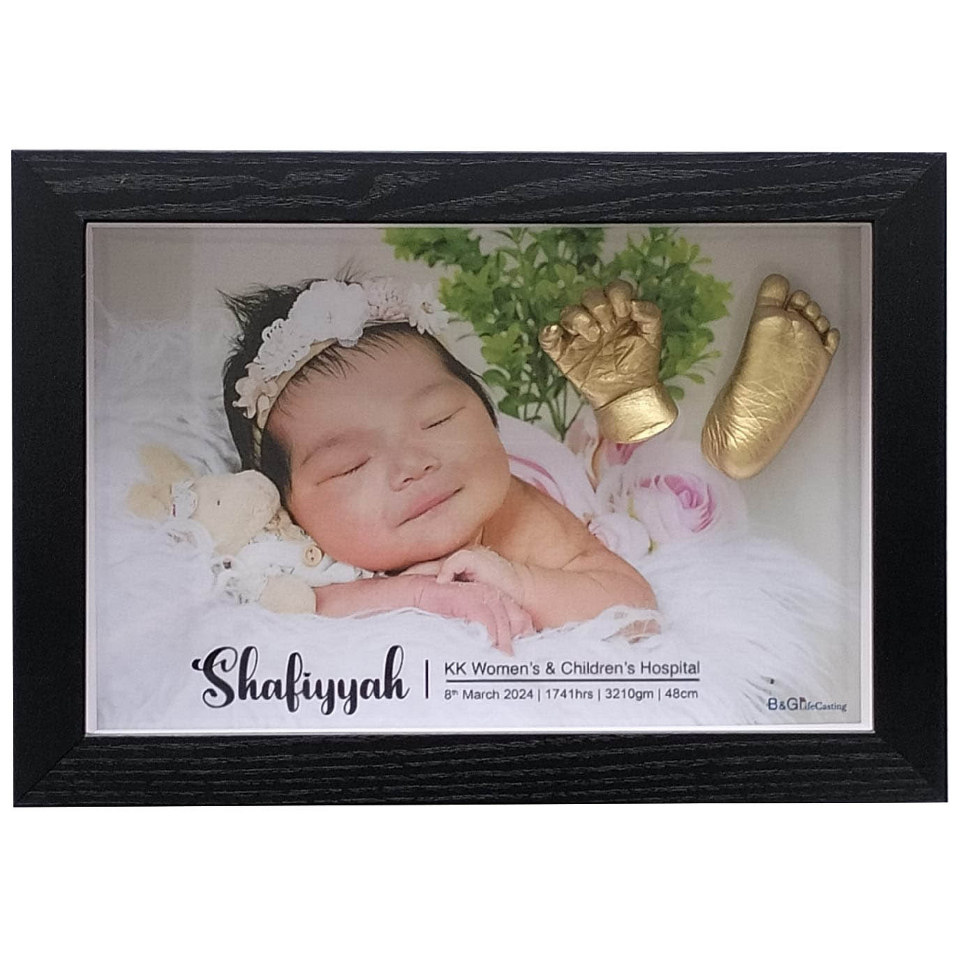 2 casts, either 2 hands casts, or 2 feet casts, or 1 hand and 1 foot casts, in either gold or silver finish, encased in a box-frame. Serving as the background of the frame will be a photo of your baby with texts. These texts may include baby’s name and birth information, religious texts or verses, or a simple blessing for your baby. There is no restriction on text length and language used.