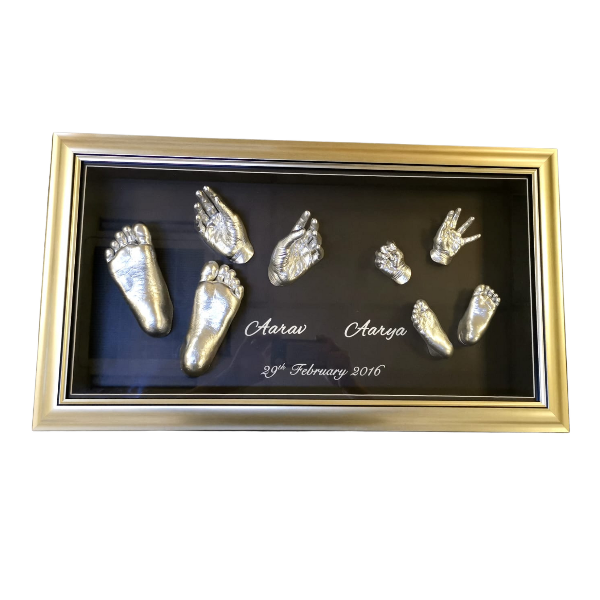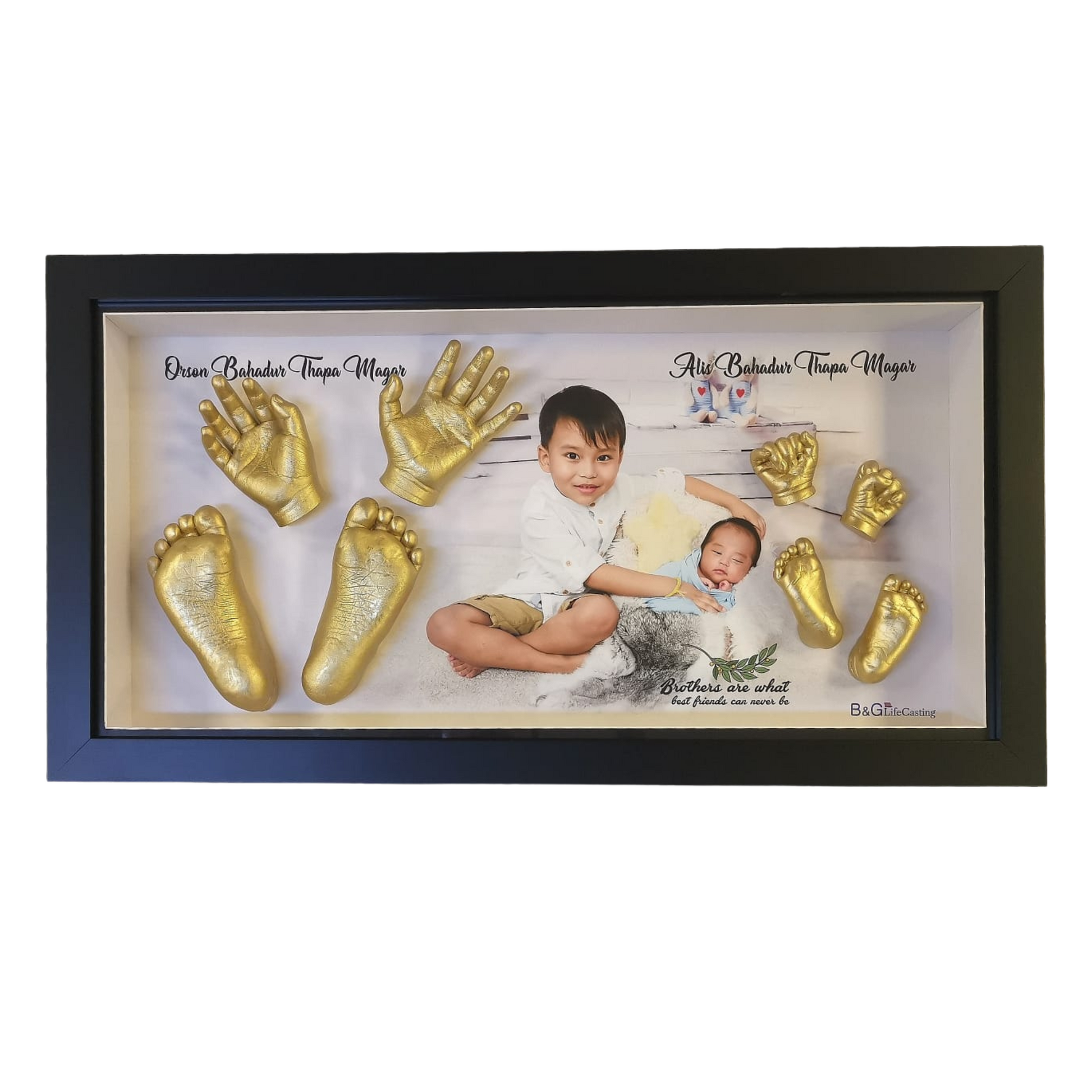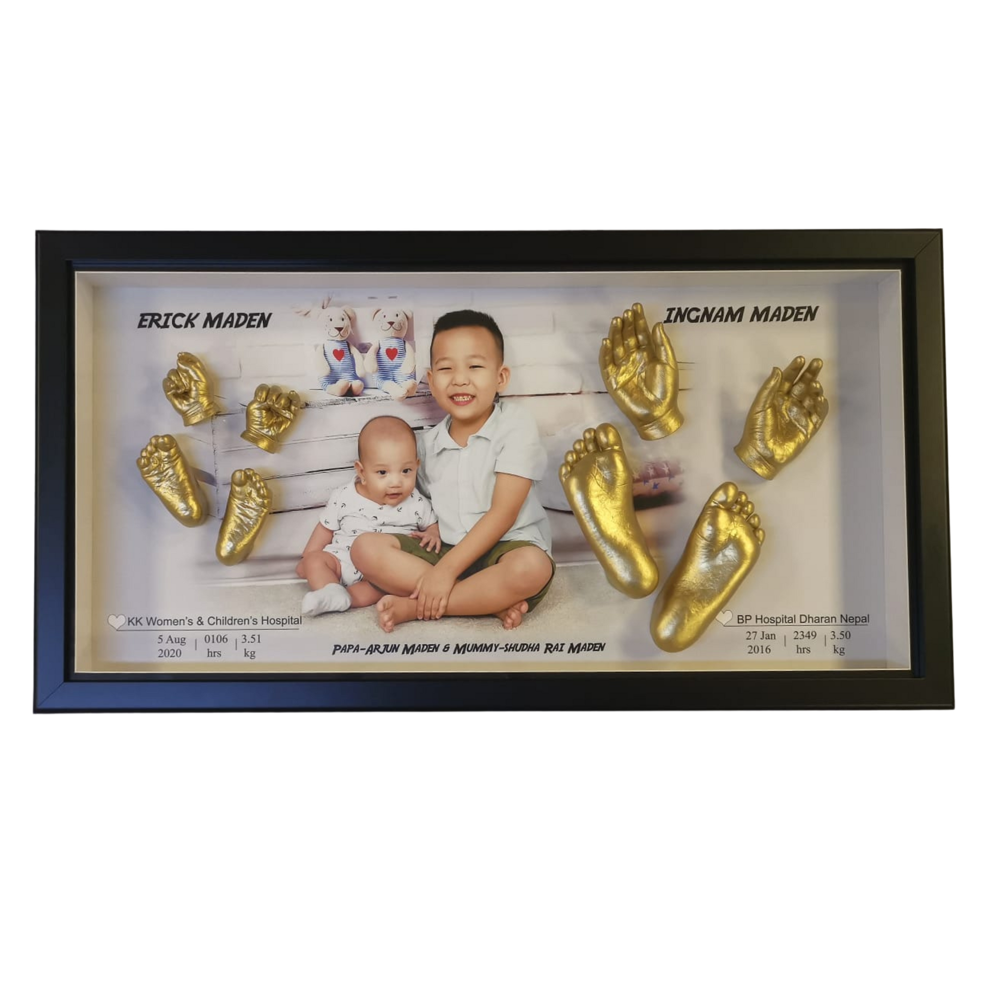 Baby’s plus older brother/sister’s hands + feet casts, in either gold or silver finish, encased in a box-frame. This frame has 4 casts from the baby and 4 casts from the older sibling, plus a photo of both together or 2 individual photos, and text. These texts may include baby’s birth information, religious texts or verses, or a simple blessing for your baby. There is no restriction on text length and language used.