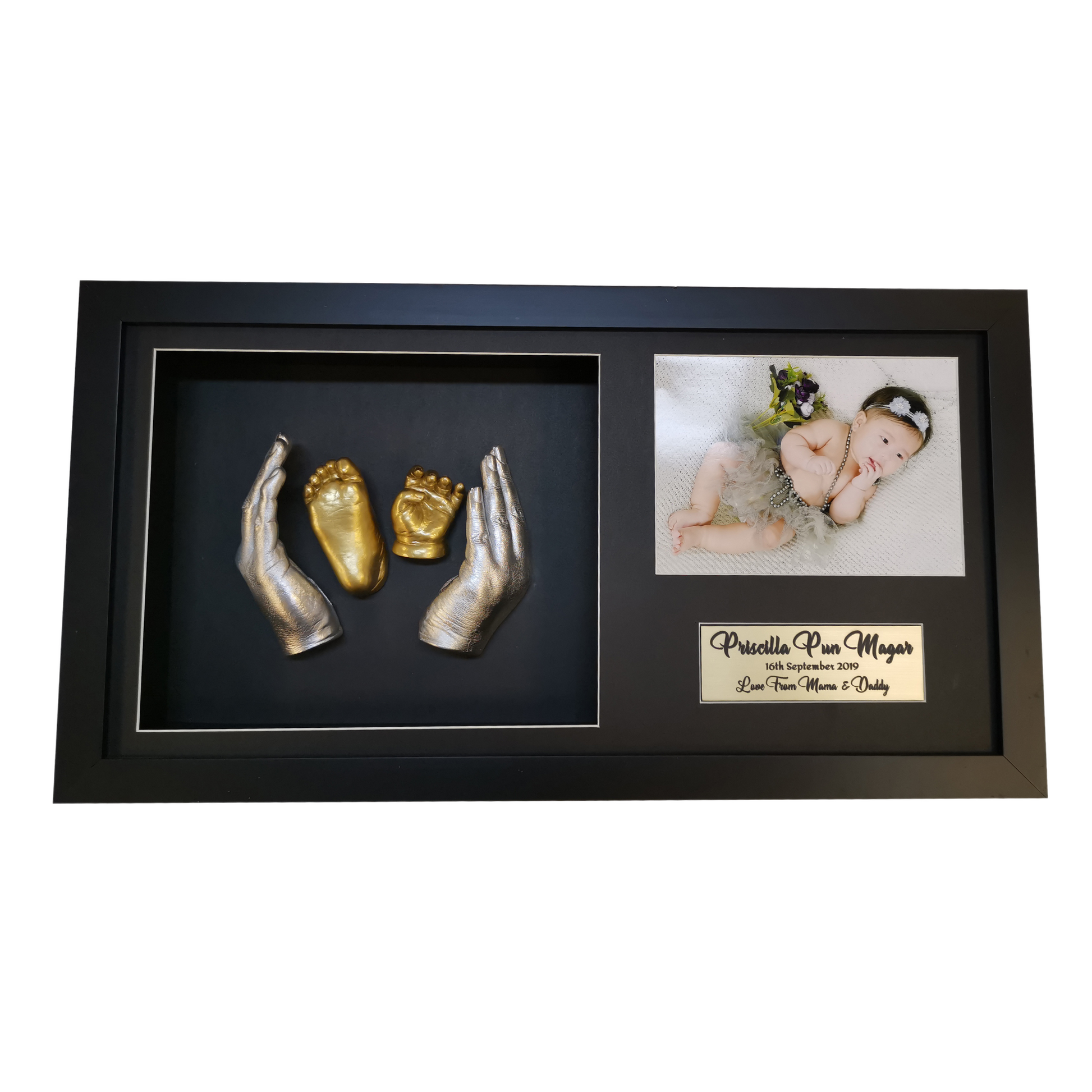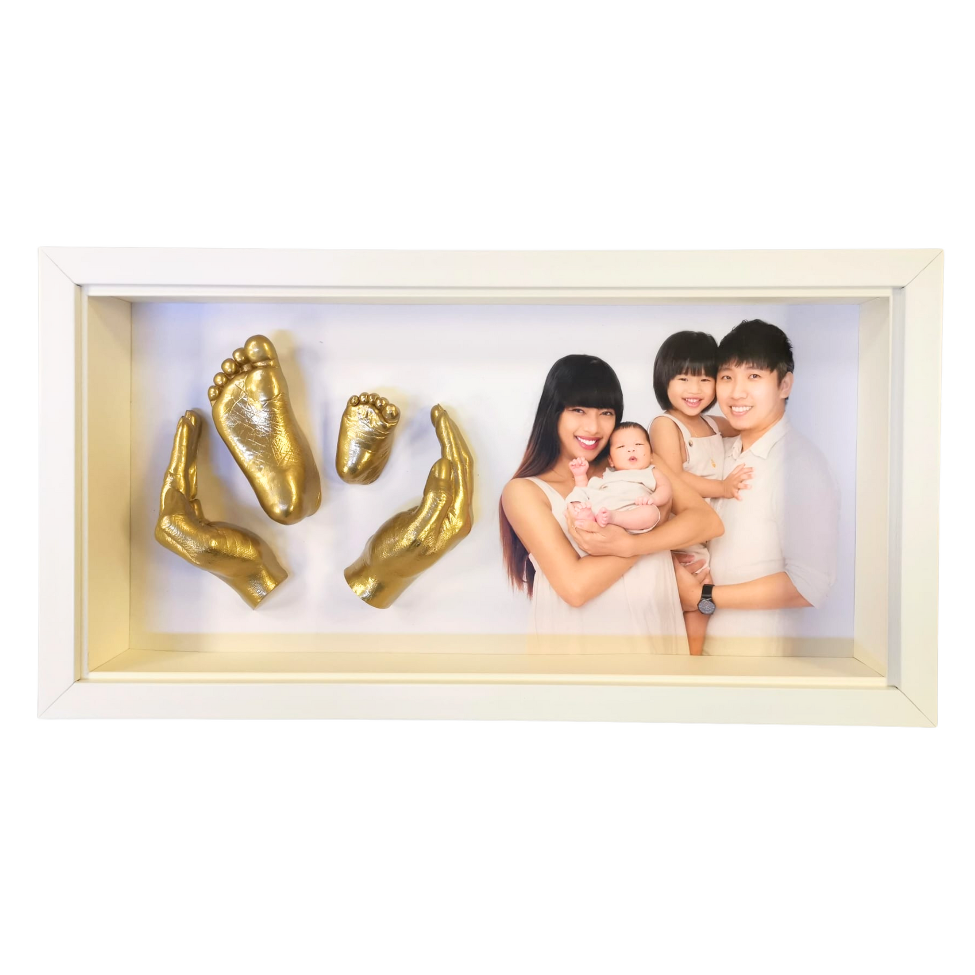 Baby’s plus parents’ hands + feet casts, in either gold or silver finish, encased in a box-frame. This frame has 4 casts in total from baby and parents, plus a photo (or just plain background with no photo) and text. These texts may include baby’s birth information, religious texts or verses, or a simple blessing for your baby. There is no restriction on text length and language used. Names can be laser-cut in acrylic at additional charge.