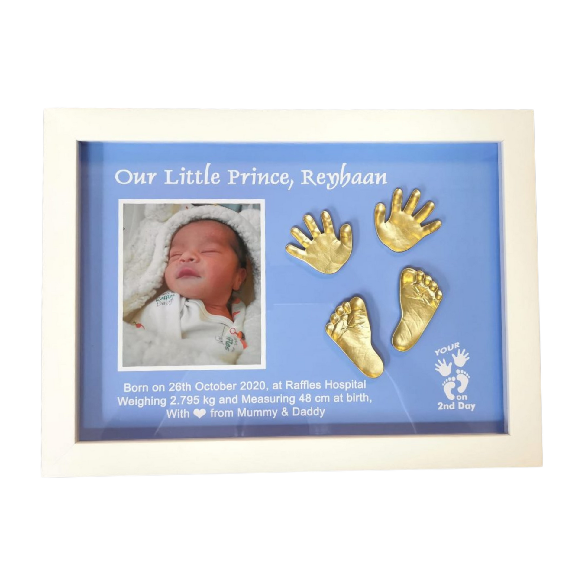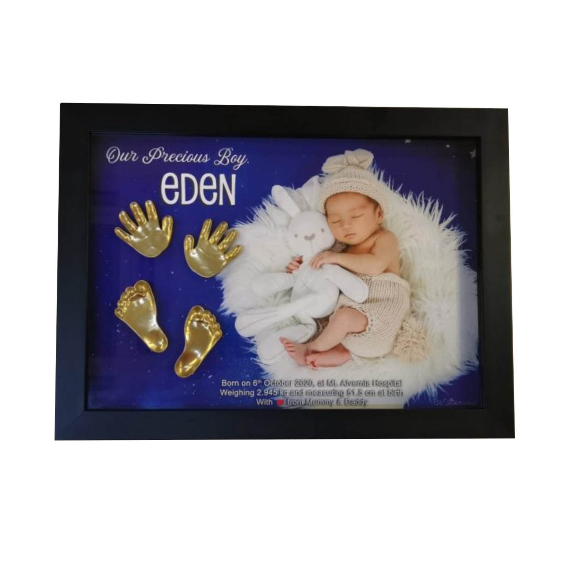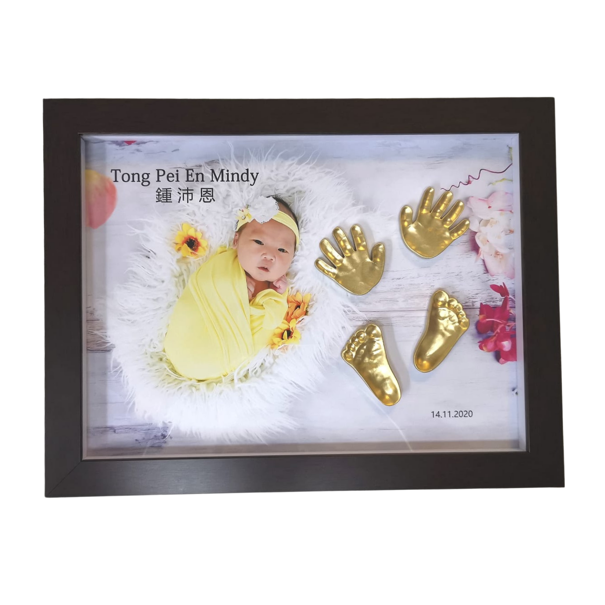 4 impression casts, in either gold or silver finish, encased within the frame. All our impression casts are encased to protect them from dusts and scratches. Serving as the background of the frame will be a photo of your baby with texts. These texts may include your baby’s name and birth information, religious texts or verses, or a simple blessing for your baby. There is no restriction on text length and language used.